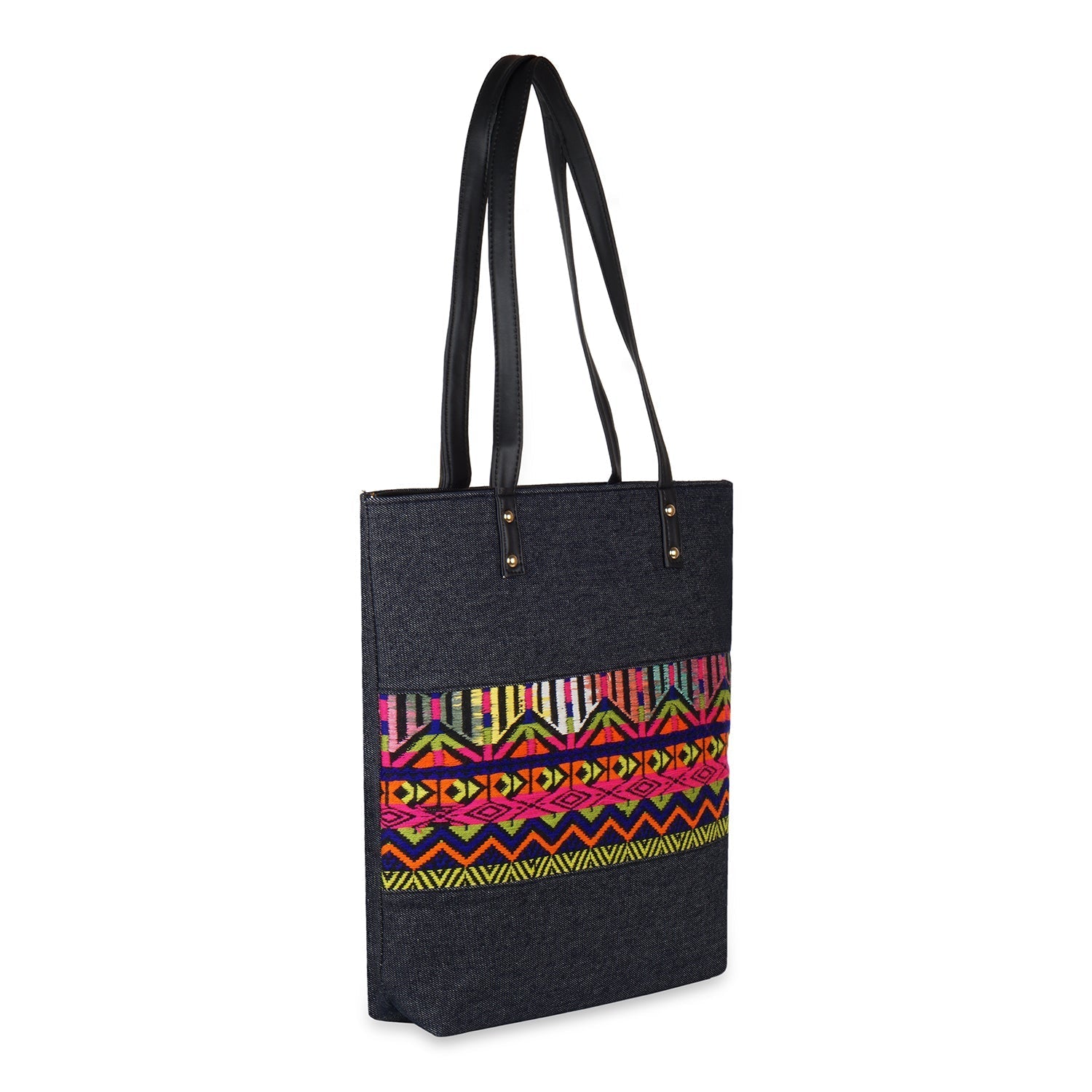 Style meets functionality with this well crafted denim fabric tote bag structured with a hint of weaved center pannel giving it a classy vintage look.