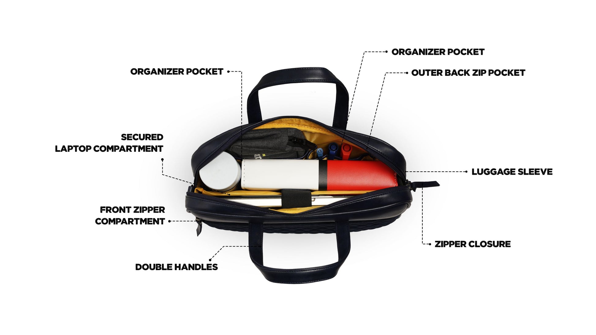 The top-loading zipper offers quick and easy access, while the thoughtfully designed interior includes a padded laptop compartment and two slip pockets to neatly store your cables, chargers, and essentials. Additional front and back zippered pockets provide extra space and convenience on the move.